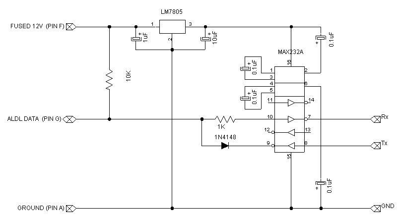 Ecu data can be read/write using one single wire (pin G from the diagnostic plug). This line is kept at the logical HIGH level by a pull up resistor wired to the 12V, helping to square the signal. TTL to Serial protocol convertion is performed by a specialized chip (MAX232A). The whole circuit power supply is drown from the car's battery (typ. 12v).